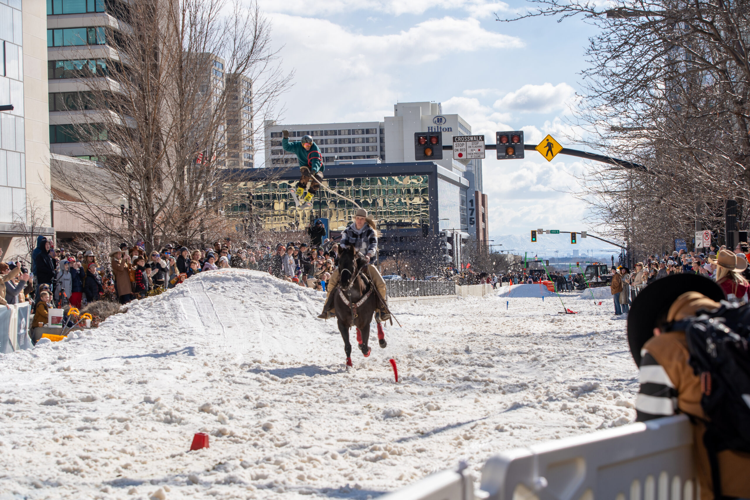 For the 2nd Annual Winter Roundup, Staker Parson Materials & Construction and Reynolds Excavation, Demolition & Utilities hauled in the snow needed for the skijoring course in downtown Salt Lake City.
